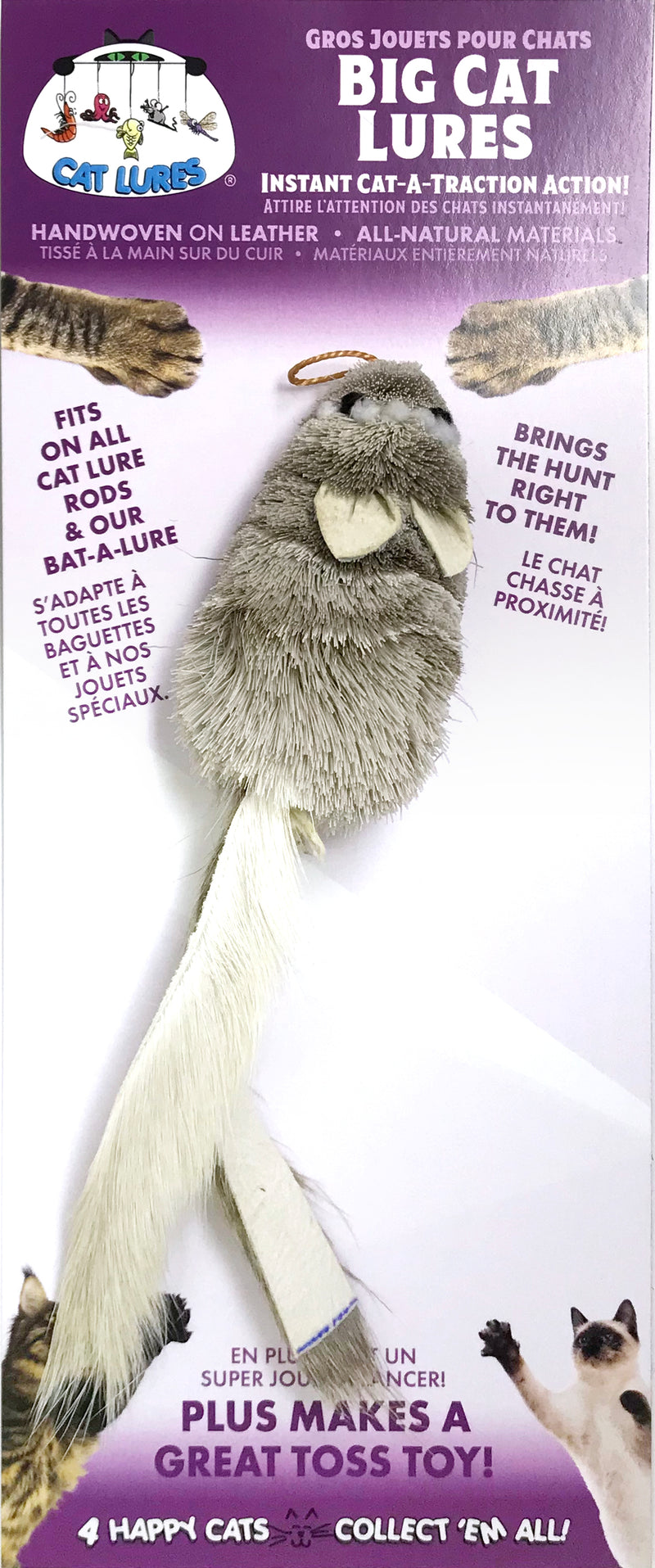 The exclusive Cat Lures cat toys are handwoven from all natural materials onto leather. All Cat Lures attach to the same easy-clip, creating a variety of interactive cat toys! These Big Cat Lures are 3 times the size as our normal lures! They make great toss toys and are perfect for any size cat!