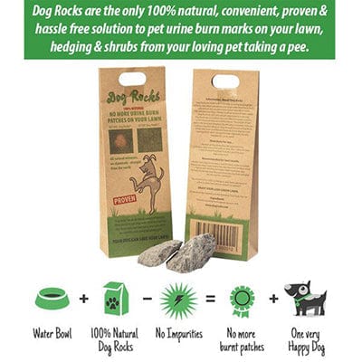 Dog Rocks are a 100% Natural Australian product that will save your lawn from those nasty burn patches that your Dog's urine can cause. Dog Rocks filter out impurities from water such as tin, ammonia and nitrates. These impurities are usually passed out through urine, and when grass comes in contact with these elements it results in urine burn on grass, resulting in a dead, yellow patch on your lawn. Dog Rocks give your four legged friend a cleaner source of water, while eliminating urine burn on grass this will result in the stop of those nasty burnt yellow patches on your lawn. Without the impurities in the water, Dog Rocks actually help your dog fertilize your lawn! This is great for you, your dog & your lawn!