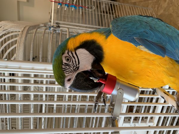 Red top takes a full 9 rotations to open while the unit swivels on its axis. Birds can see the treat inside through the window but have to get the lid off to get the treat!