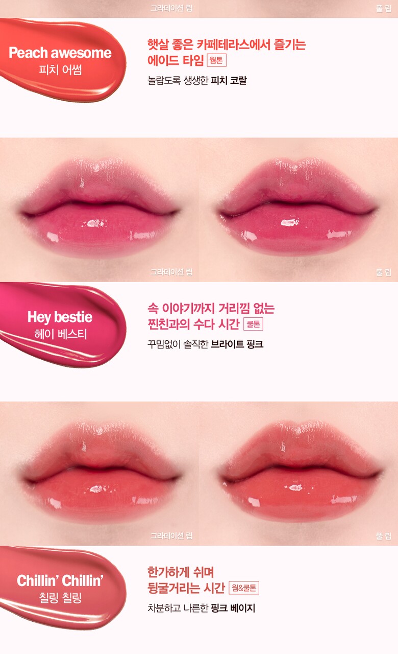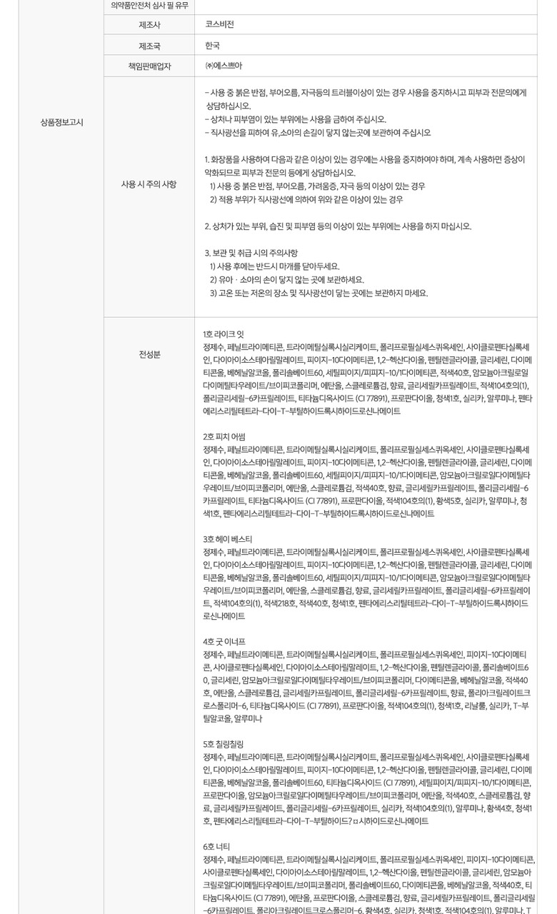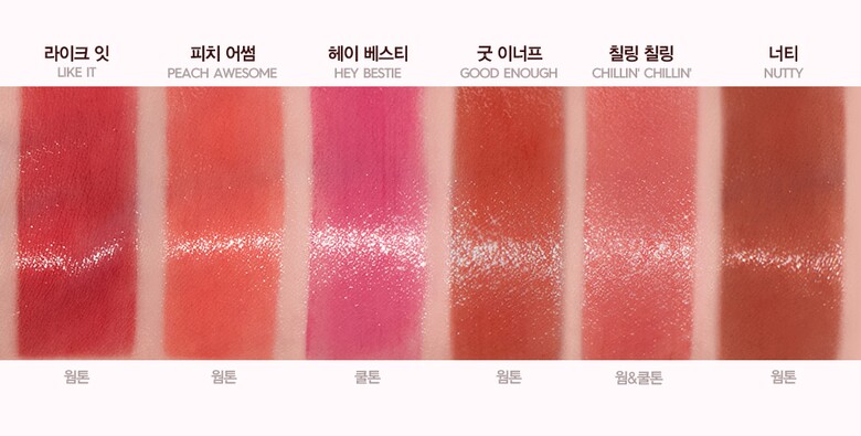 Ingredients | [#01 LIKE IT] Water, Phenyl Trimethicone, Trimethylsiloxysilicate, Polypropylsilsesquioxane, Cyclopentasiloxane, Diisostearyl Malate, PEG-10 Dimethicone, 1,2-Hexanediol, Pentylene Glycol, Glycerin, Dimethiconol, Behenyl Alcohol, Polysorbate 60, Cetyl PEG/PPG-10/1 Dimethicone, Allura Red, Ammonium Acryloyldimethyltaurate/VP Copolymer, Ethanol, Sclerotium Gum, Fragrance, Glyceryl Caprylate, Phloxine B, Polyglyceryl-6 Caprylate, Titanium Dioxide (CI 77891), Propanediol, Brilliant Blue FCF, Silica, Alumina, Pentaerythrityl Tetra-di-t-butyl Hydroxyhydrocinnamate [#02 PEACE AWESOME] Water, Phenyl Trimethicone, Trimethylsiloxysilicate, Polypropylsilsesquioxane, Cyclopentasiloxane, Diisostearyl Malate, PEG-10 Dimethicone, 1,2-Hexanediol, Pentylene Glycol, Glycerin, Dimethiconol, Behenyl Alcohol, Polysorbate 60, Cetyl PEG/PPG-10/1 Dimethicone, Ammonium Acryloyldimethyltaurate/VP Copolymer, Ethanol, Sclerotium Gum, Allura Red, Fragrance, Glyceryl Caprylate, Polyglyceryl-6 Caprylate, Titanium Dioxide (CI 77891), Propanediol, Phloxine B, Sunset Yellow FCF, Silica, Alumina, Brilliant Blue FCF, Pentaerythrityl Tetra-di-t-butyl Hydroxyhydrocinnamate [#03 HEY BESTIE] Water, Phenyl Trimethicone, Trimethylsiloxysilicate, Polypropylsilsesquioxane, Cyclopentasiloxane, Diisostearyl Malate, PEG-10 Dimethicone, 1,2-Hexanediol, Pentylene Glycol, Glycerin, Dimethiconol, Behenyl Alcohol, Polysorbate 60, Cetyl PEG/PPG-10/1 Dimethicone, Ammonium Acryloyldimethyltaurate/VP Copolymer, Ethanol, Sclerotium Gum, Fragrance, Glyceryl Caprylate, Polyglyceryl-6 Caprylate, Phloxine B, Tetrachlorotetrabromofluorescein, Allura Red, Brilliant Blue FCF, Pentaerythrityl Tetra-di-t-butyl Hydroxyhydrocinnamate [#05 CHILLIN�?CHILLIN’] Water, Phenyl Trimethicone, Trimethylsiloxysilicate, Polypropylsilsesquioxane, Cyclopentasiloxane, Diisostearyl Malate, PEG-10 Dimethicone, 1,2-Hexanediol, Pentylene Glycol, Glycerin, Dimethiconol, Behenyl Alcohol, Polysorbate 60, Titanium Dioxide (CI 77891), Cetyl PEG/PPG-10/1 Dimethicone, Propanediol, Ammonium Acryloyldimethyltaurate/VP Copolymer, Ethanol, Allura Red, Sclerotium Gum, Fragrance, Glyceryl Caprylate, Polyglyceryl-6 Caprylate, Silica, Phloxine B, Alumina, Tartrazine, Brilliant Blue FCF, Pentaerythrityl Tetra-di-t-butyl Hydroxyhydrocinnamate |