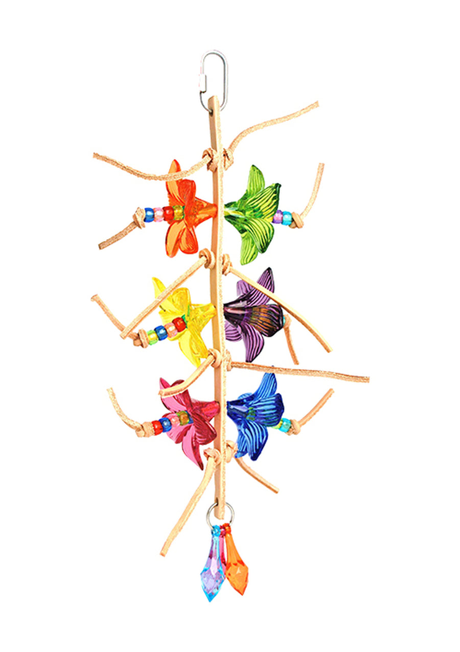 A 1/2" wide piece of vegetable tanned leather hanging colorful acrylic flowers on each side with 1/8" vegetable tanned leather strips and pony beads tied thru the center of each flower, other leather strips are tied between flowers. Three signature beads hanging at bottom. Included one of 3/4" diameter stainless steel "O" ring and one of 2.5mm stainless steel quicklink. Width: 6". Overall Length: 13". For small and medium sized birds. Made in U